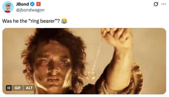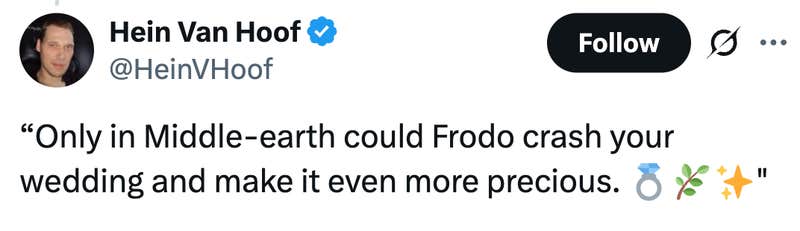 “Only in Middle-earth could Frodo crash your wedding and make it even more precious,” someone else shared.