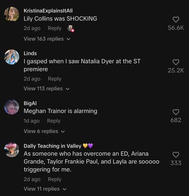 Additionally, some commenters pointed to creators who promote restrictive eating patterns. A TikToker wrote, “Bethenny Frankel is actively teaching women how to eat the bare minimum to stay out of the hospital.” Others brought up names they believed participated in the rapid-weight-loss craze tied to drugs like Ozempic, including Michelle Yeoh and Lindsay Hubbard.