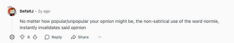 “No matter how popular/unpopular your opinion might be, the non-satirical use of the word normie instantly invalidates said opinion,” commented u/DefaltJ.