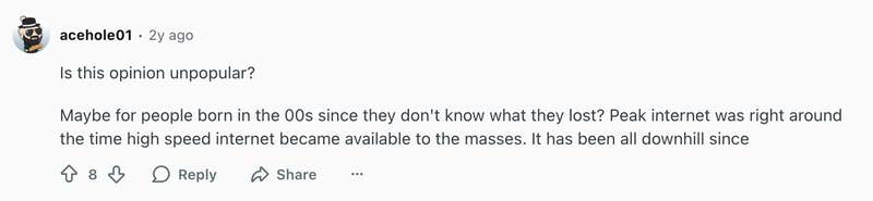 “Peak internet was right around the time high-speed internet became available to the masses. It has been all downhill since,” said someone else, also questioning whether this was truly an unpopular opinion.