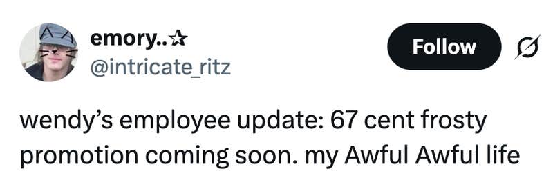 “Wendy’s employee update: 67 cent Frosty promotion coming soon,” a Wendy’s worker posted to X. “My Awful Awful life.”
