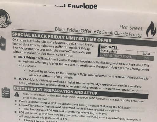 According to a document allegedly given to a Wendy’s worker, which they shared on Reddit, the chain will offer 67-cent Frostys on Black Friday, Nov. 28. Additionally, the 67-cent Frosty will be available through online ordering and the mobile app until Dec. 7.
