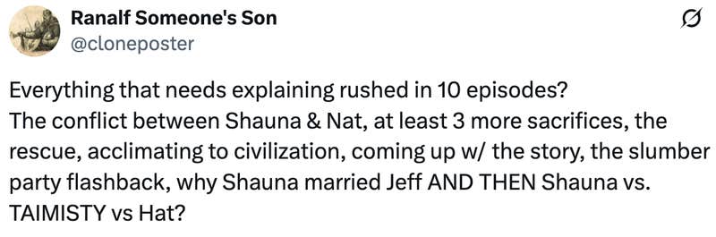 “Everything that needs explaining rushed in 10 episodes? The conflict between Shauna & Nat, at least 3 more sacrifices, the rescue, acclimating to civilization, coming up w/ the story, the slumber party flashback, why Shauna married Jeff AND THEN Shauna vs. TAIMISTY vs Hat?” one fan commented on the announcement.