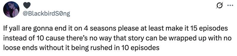 “If y’all are gonna end it on 4 seasons, please at least make it 15 episodes instead of 10, cause there’s no way that story can be wrapped up with no loose ends without it being rushed in 10 episodes,” one person suggested.