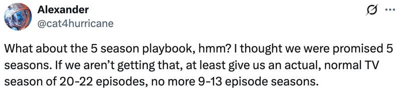 “What about the 5-season playbook, hmm? I thought we were promised 5 seasons. If we aren’t getting that, at least give us an actual, normal TV season of 20-22 episodes, no more 9-13 episode seasons,” another fan wondered.