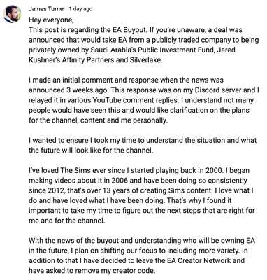 James Turner posted his announcement on YouTube, telling his fans that he “decided to leave the EA Creator Network and have asked to remove my creator code.”