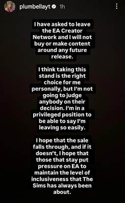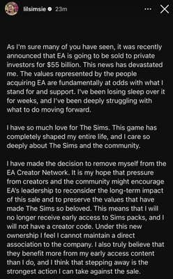 For longtime contributors like lilsimsie, leaving the EA Creator Network was a way to take a stand. Their departures signal that the buyout isn’t just a business story—it’s a reckoning over how corporate deals can collide with the personal values of the communities that help define a brand.