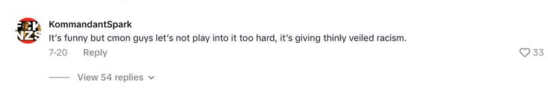 “It’s funny, but c’mon, guys, let’s not play into it too hard, it’s giving thinly veiled racism,” wrote KommandentSpark.