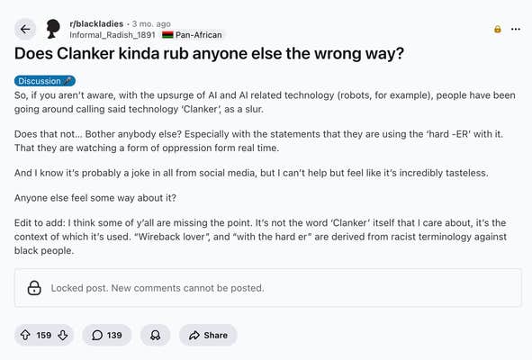 “Does Clanker kinda rub anyone else the wrong way?” u/Informal_Radish_1891 asked 3 months ago on the r/blackladies subreddit.