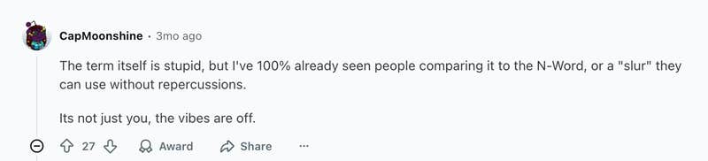 “The term itself is stupid, but I’ve 100% already seen people comparing it to the N-Word, or a ‘slur’ they can use without repercussions,” someone replied. “It’s not just you, the vibes are off.”