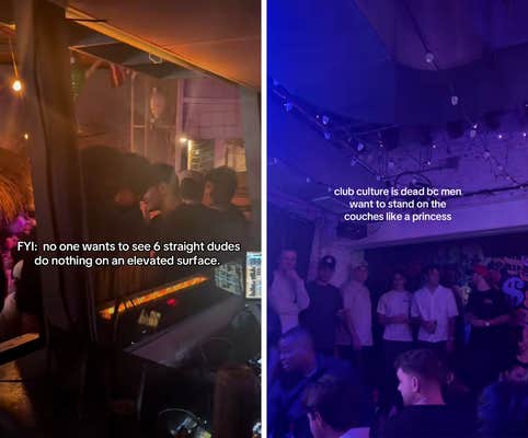 Hannah (@hannaemilyy) shared similar footage from a packed club, where at least seven guys are standing on couches, and none are actually dancing, except for one. Her text overlay states: “Club culture is dead bc men want to stand on the couches like a princess.” The caption asks pointedly: “Are you not embarrassed truly?”