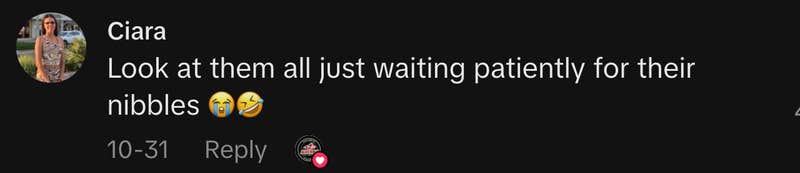 Commenters were amused by the interaction. one said, “Look at them all just waiting patiently for their nibbles.”