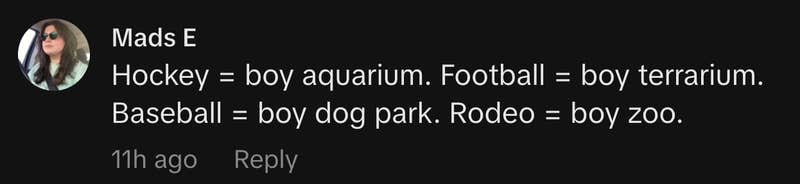 “Hockey = boy aquarium. Football = boy terrarium. Baseball = boy dog park. Rodeo = boy zoo.”