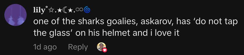“One of the Sharks goalies, Askarov, has ‘do not tap the glass’ on his helmet, and i love i.t”